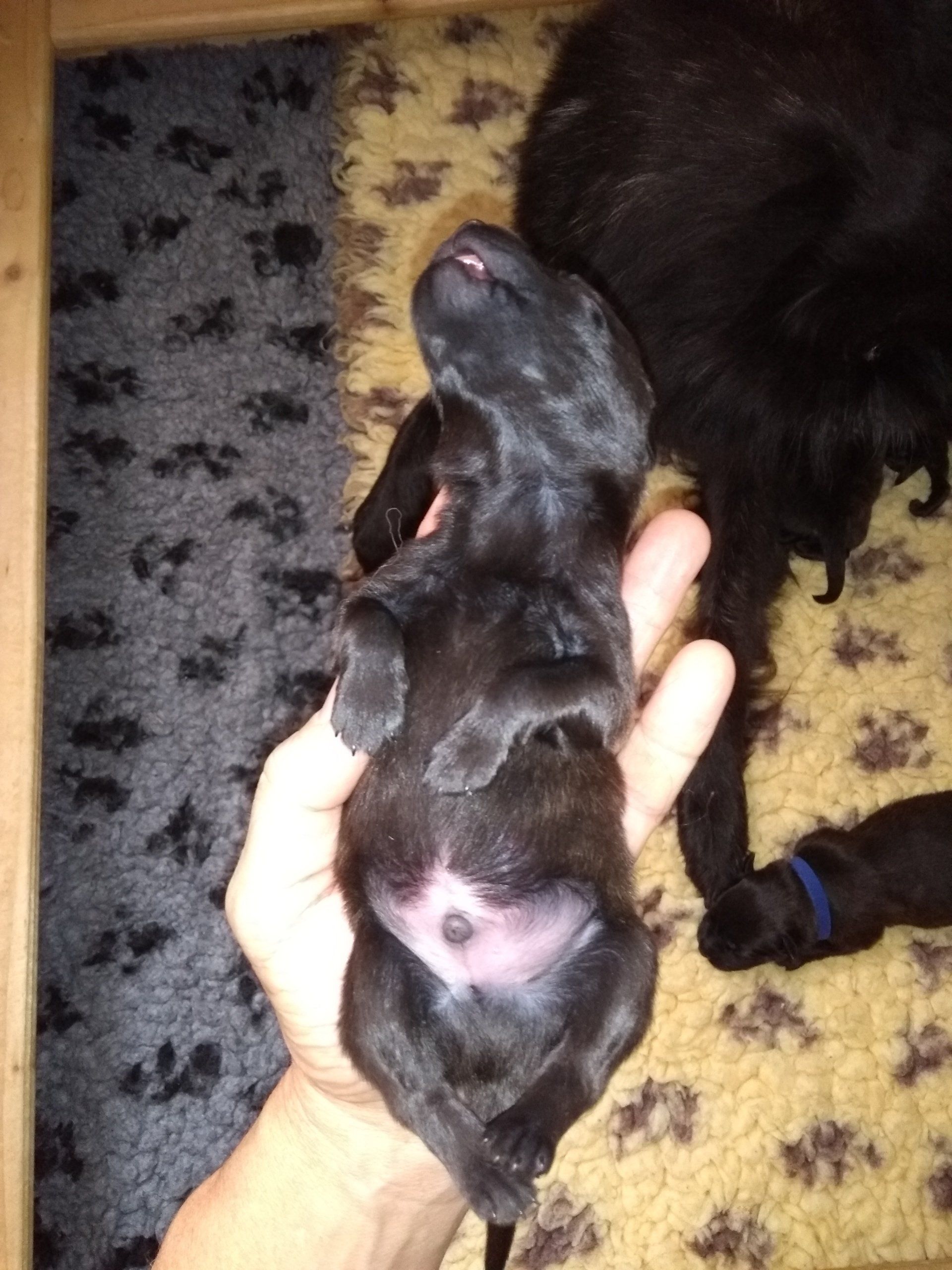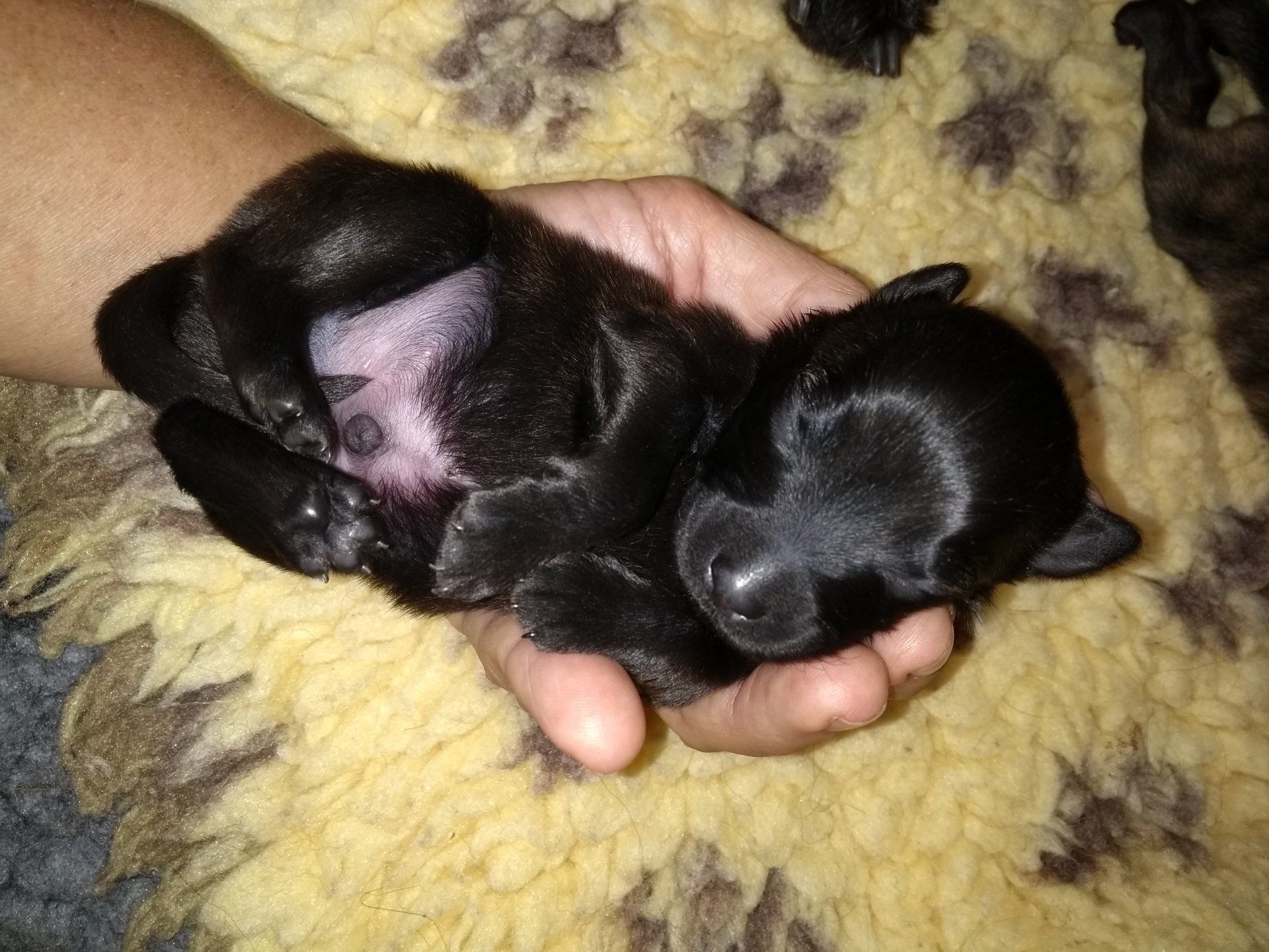 Alle Welpen sind gesund und kräftig. Die kleinste Hündin hatte ein Geburtsgewicht von 160g, der große Rüde wog das Doppelte, 320g. Die Kleine kann ihre Körpertemperatur am schlechtesten halten, Kiyani nimmt sie die ersten beiden Tage immer wieder auf Seite um sie extra zu säugen. Im Alter von zwei Tagen macht die Kleine Aaltje ihr Weniger an Körperkraft schon durch ein Mehr an Geschicklichkeit wett!